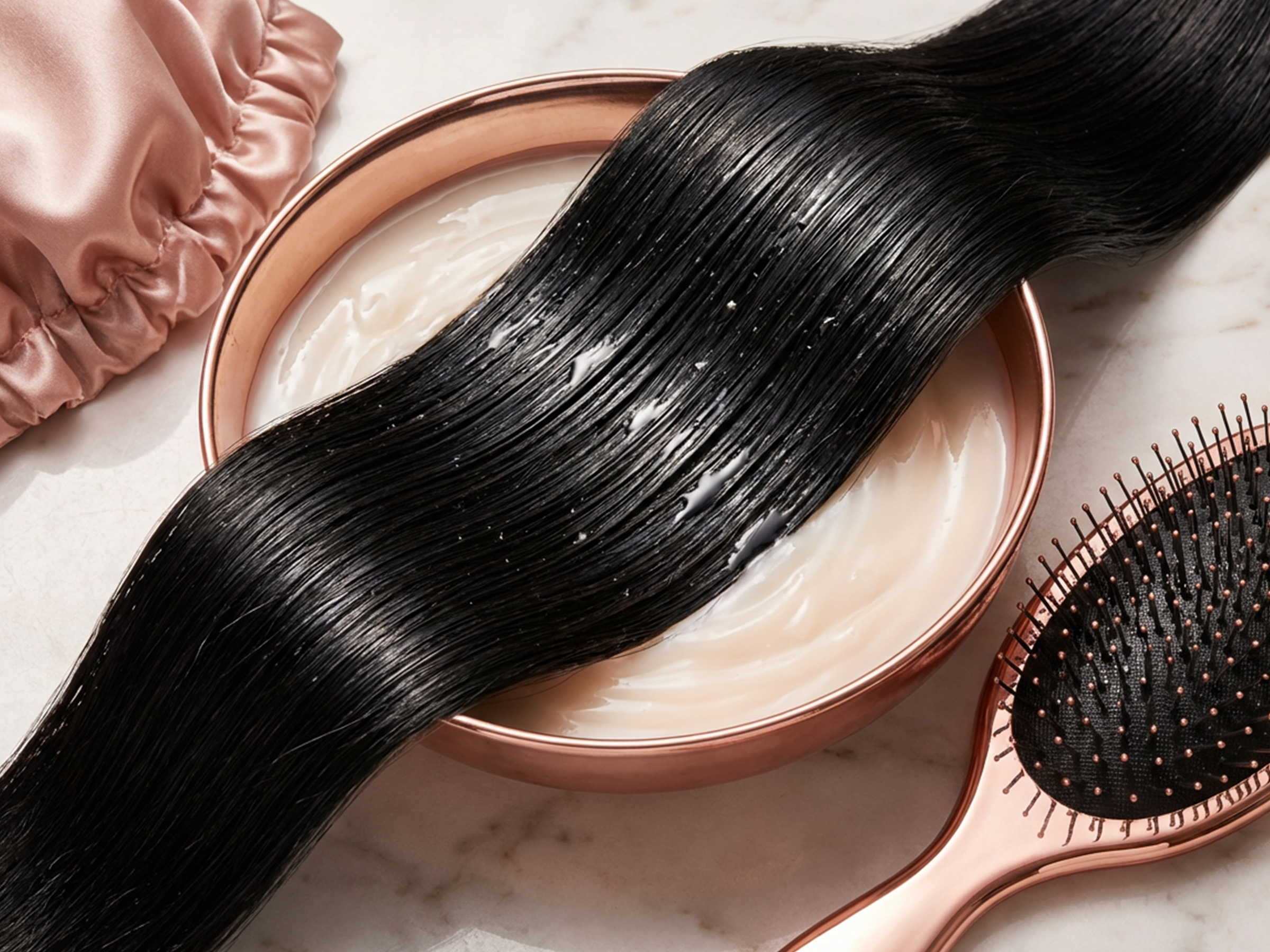 For a smooth, glass-like finish, complete your style with a lightweight serum that enhances shine without weighing the hair down. To maintain results overnight, wrap the hair or pin-curl before bed so you wake up to polished, touchable hair.